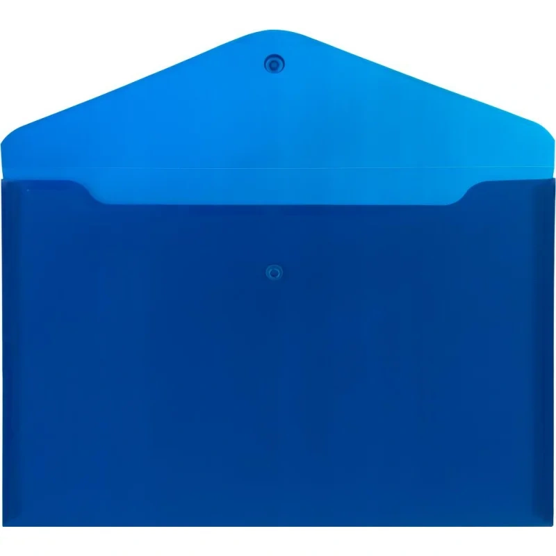 Папка-конверт с гладкой фактурой формата А4 изготовлена из плотного пластика синего цвета толщиной 200 мкм. Закрывается на защелку-кнопку, что делает удобным частое использование и обеспечивает быстрый доступ к ее содержимому. Папка способна вместить до 100 листов стандартной плотности.