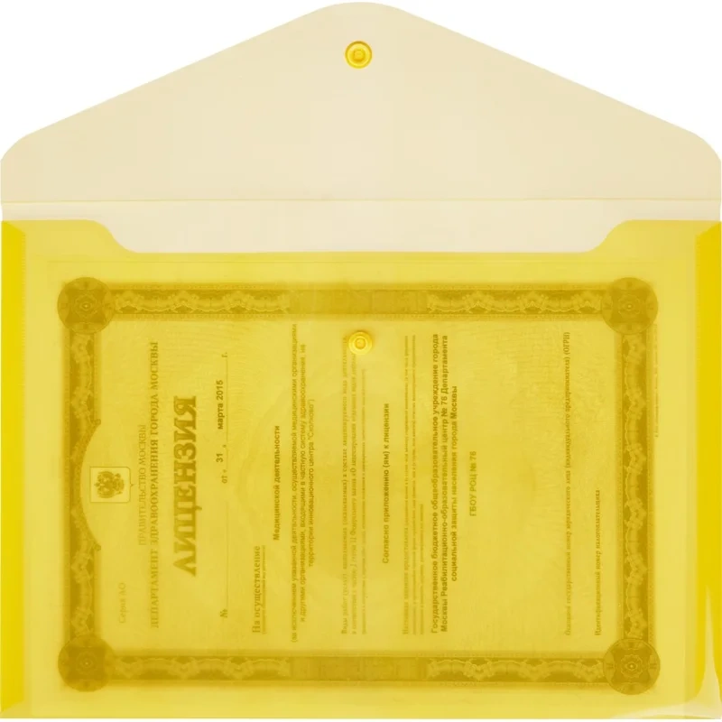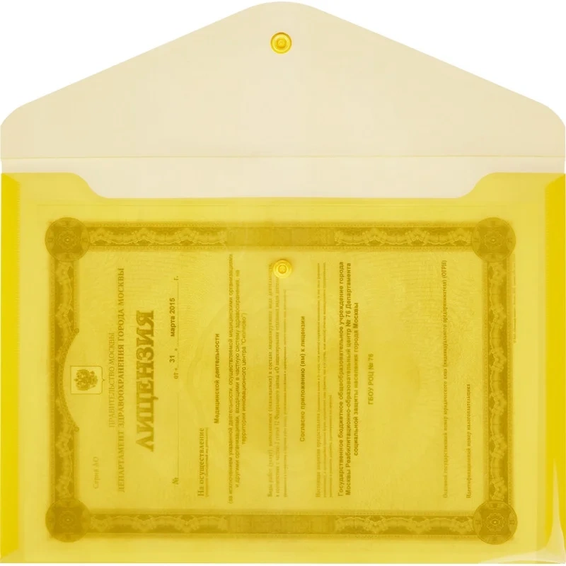 Папка-конверт формата А4 изготовлена из прозрачного пластика толщиной 0,18 мм желтого цвета. Внешний размер составляет 236x330 мм. Закрывается на кнопку. Удобна для хранения и переноски документов, предотвращает их смятие и загрязнение. Вмещает до 120 листов стандартной плотности.