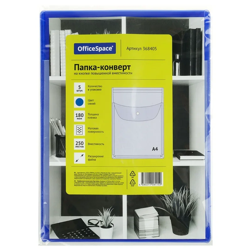 Расширяющаяся папка-конверт на кнопке OfficeSpace формата А4 размером 310*238 мм предназначены для хранения и транспортировки документов, защищают документы от внешних воздействий. Вертикальная ориентация, толщина пленки 180 мкм. В упаковке 5 штук. Цвет: синий. Благодаря расширению вмещает объемные документы, а также рисунки, альбомы и другие принадлежности для творческих занятий дошкольников и школьников.