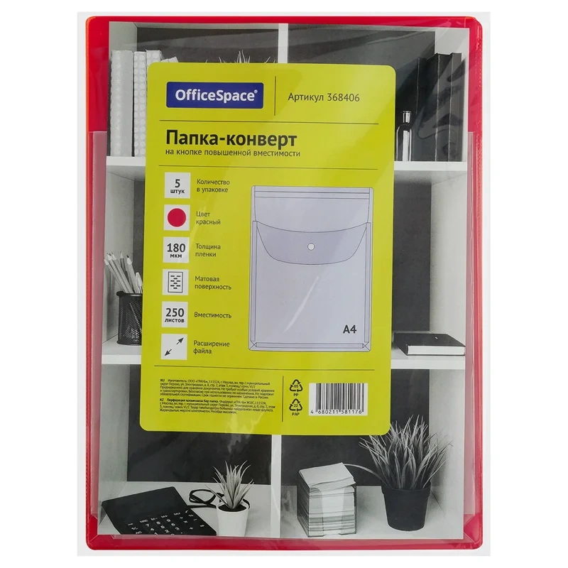 Расширяющаяся папка-конверт на кнопке OfficeSpace формата А4 размером 310*238 мм предназначены для хранения и транспортировки документов, защищают документы от внешних воздействий. Вертикальная ориентация, толщина пленки 180 мкм. В упаковке 5 штук. Цвет: красный. Благодаря расширению вмещает объемные документы, а также рисунки, альбомы и другие принадлежности для творческих занятий дошкольников и школьников.