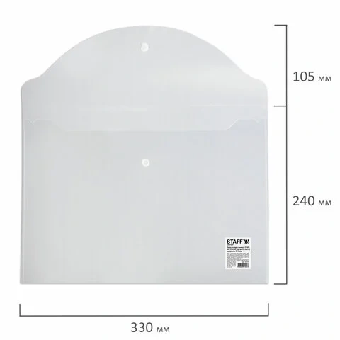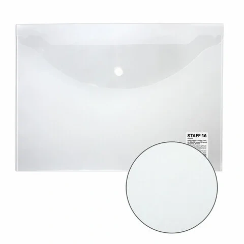 Изготовлена из прозрачного пластика толщиной 120 мкм. Папка-конверт с гладкой фактурой формата А4 закрывается на защелку-кнопку, что делает удобным частое использование и обеспечивает быстрый доступ к ее содержимому. Папка способна вместить до 100 листов стандартной плотности.