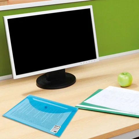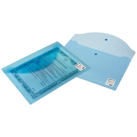 Изготовлена из прозрачного пластика синего цвета толщиной 120 мкм. Папка-конверт с гладкой фактурой формата А4 закрывается на защелку-кнопку, что делает удобным частое использование и обеспечивает быстрый доступ к ее содержимому. Папка способна вместить до 100 листов стандартной плотности.