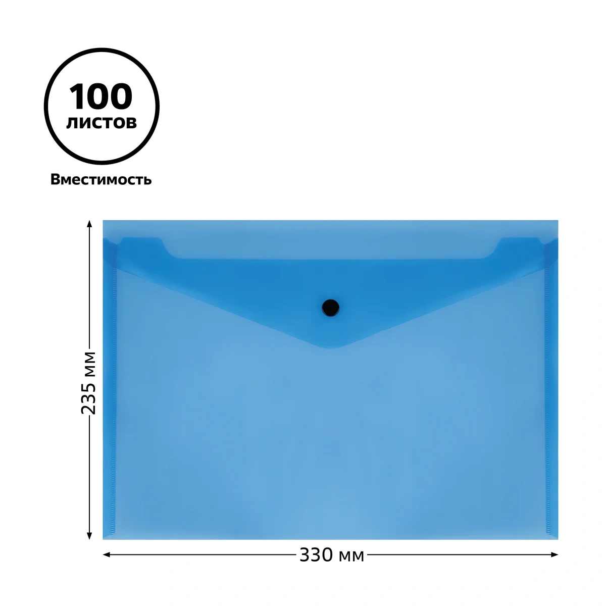 Папка-конверт на кнопке «СТАММ» формата А4 изготовлена из качественного полипропилена толщиной 150 мкм. Размер изделия составляет 330*235 мм, ориентация – горизонтальная. Предназначена для хранения и транспортировки бумаг. Папка плотно закрывается клапаном с кнопкой и надёжно защищает документы от влаги и пыли. Имеет глянцевую текстуру. Вместимость – до 100 листов. Цвет изделия – синий.