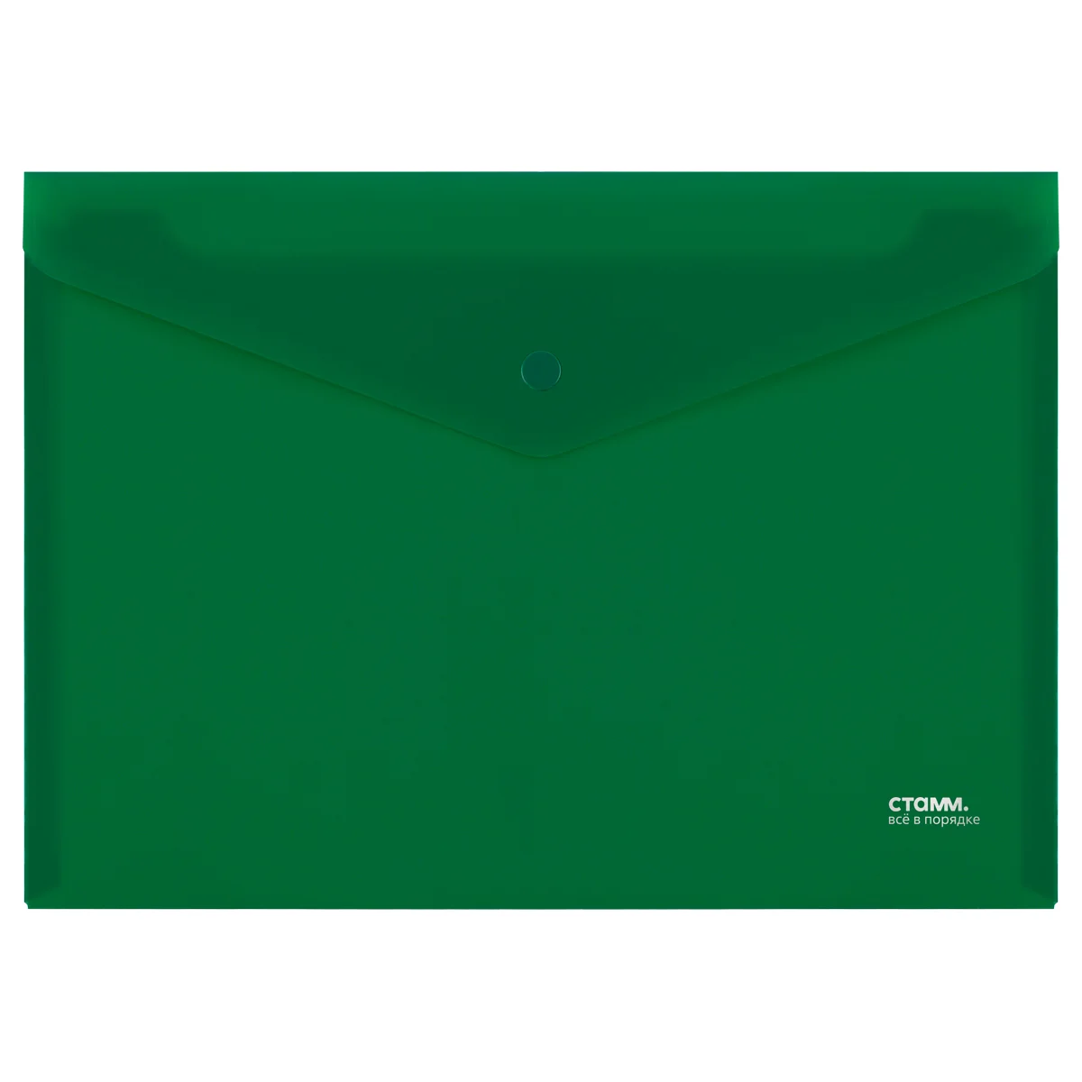 Папка-конверт на кнопке СТАММ А4, 180мкм, пластик, непрозрачная, зеленая