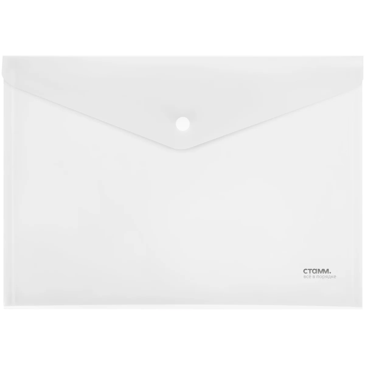 Папка-конверт на кнопке «СТАММ» формата А4 надёжно защищает документы от влаги и пыли. Горизонтальное изделие вмещает до 100 листов. Цвет папки – прозрачный бесцветный. Она изготовлена из качественного полипропилена плотностью 180 мкм с глянцевой текстурой. Размер папки составляет 330*235 мм. Изделие плотно закрывается на кнопку.