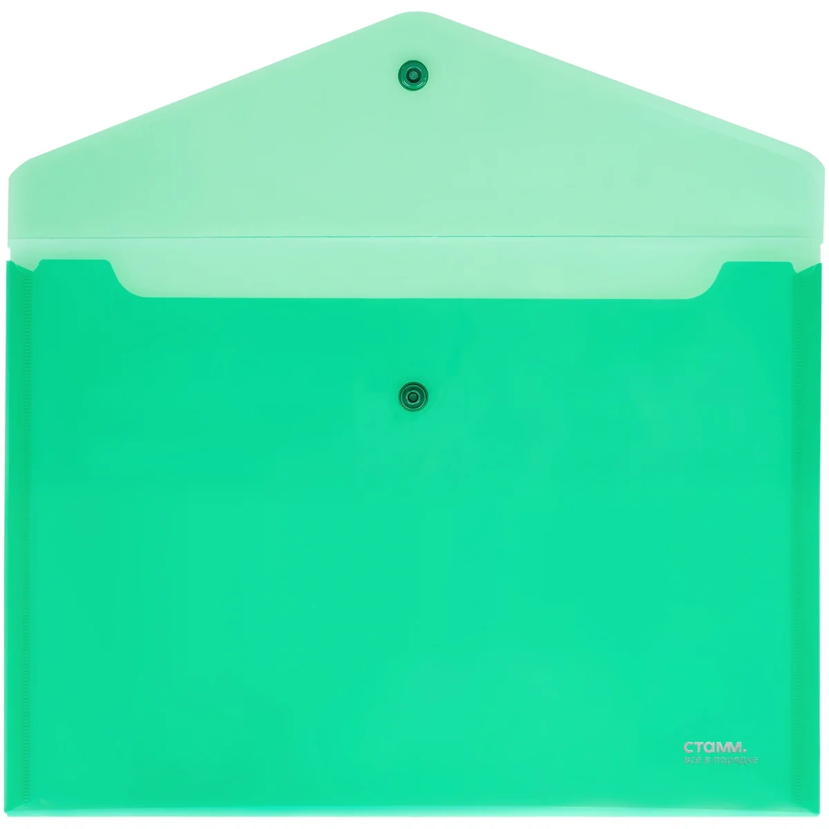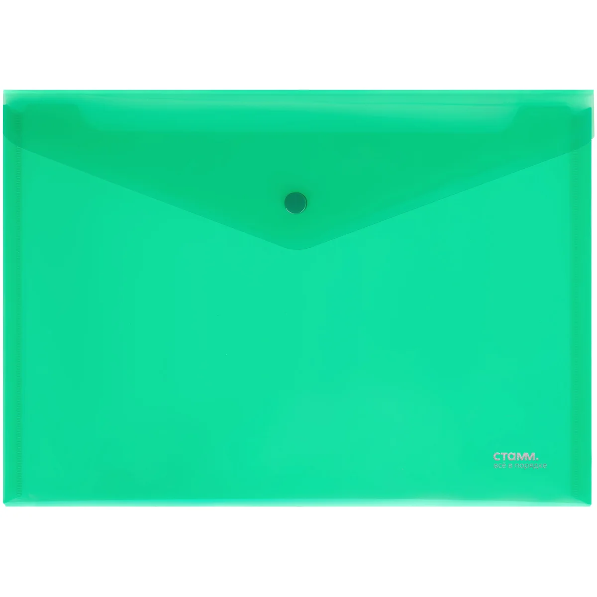 Папка-конверт на кнопке СТАММ А4, 180мкм, пластик, прозрачная, зеленая