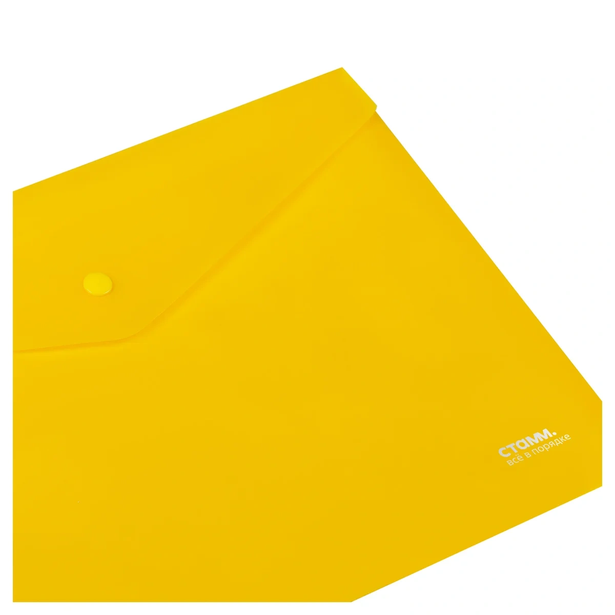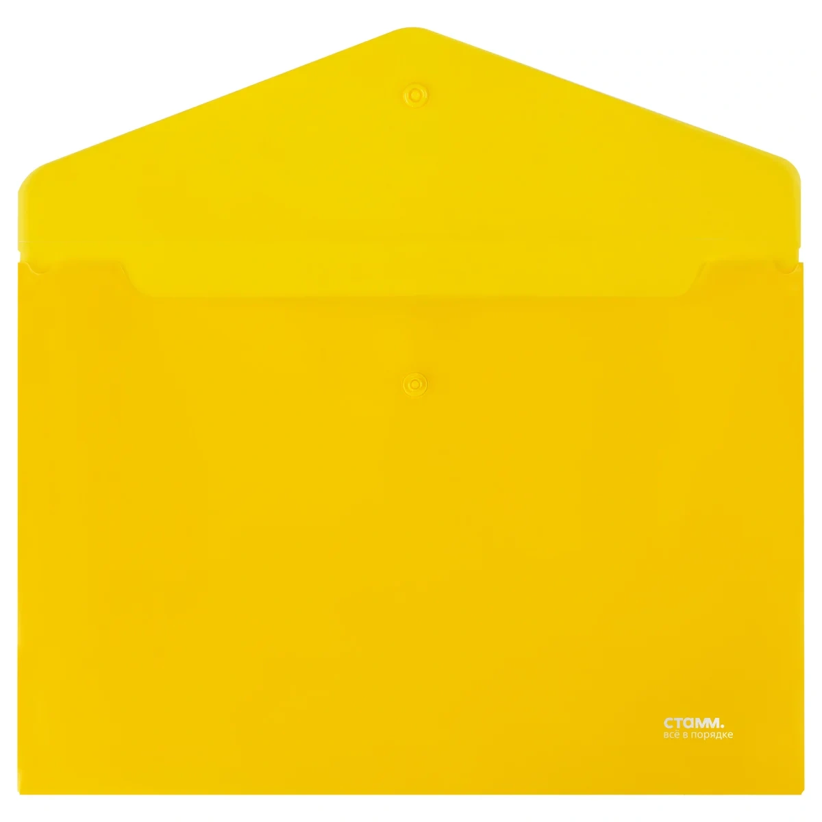 Папка-конверт на кнопке «СТАММ» формата А4 надёжно защищает документы от влаги и пыли. Горизонтальная папка вмещает до 100 листов. Цвет папки – прозрачный жёлтый. Папка изготовлена из качественного полипропилена плотностью 180 мкм с глянцевой текстурой. Размер папки составляет 330*235 мм. Изделие плотно закрывается клапаном с кнопкой.
