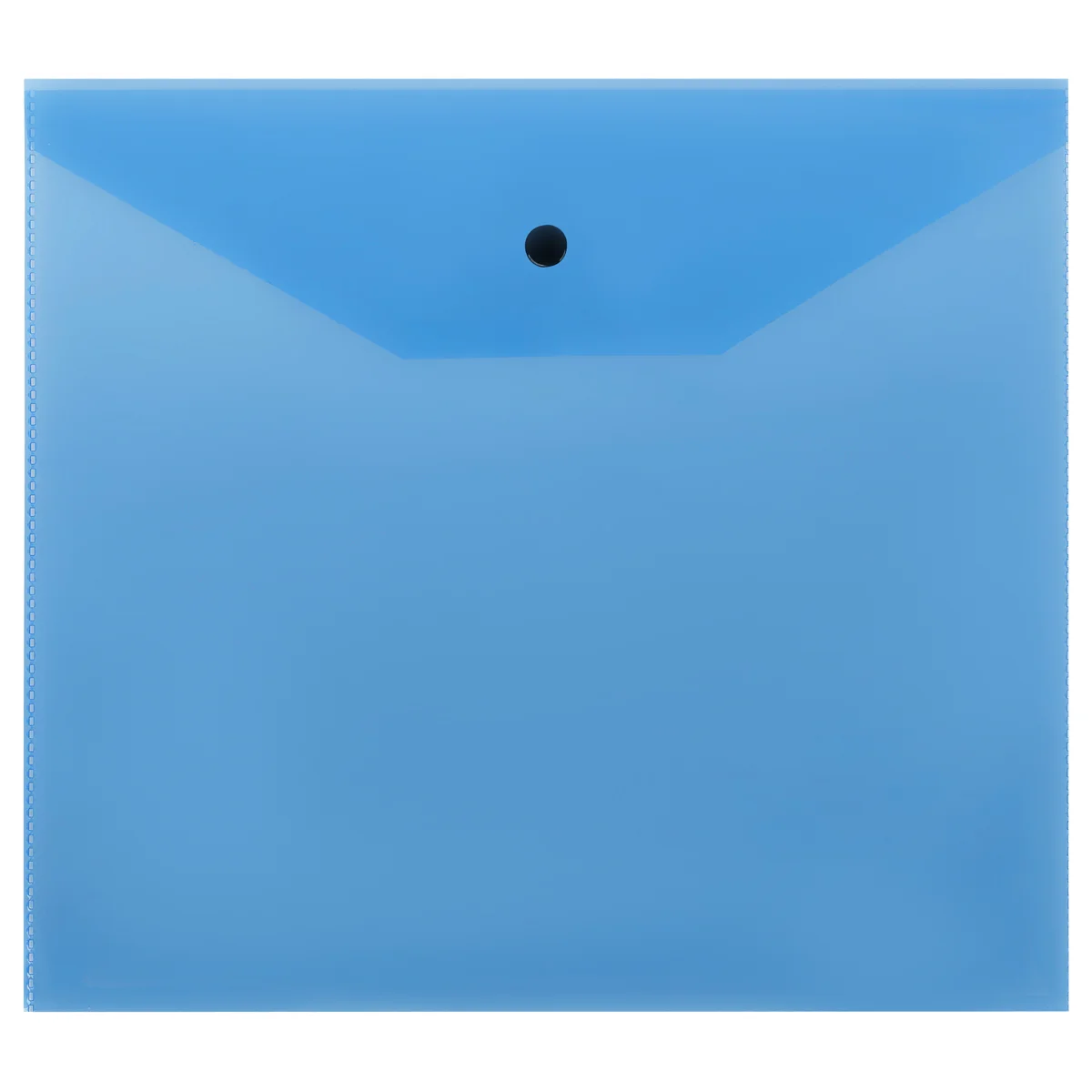 Папка-конверт на кнопке «СТАММ» формата А5+ надёжно защищает документы от влаги и пыли. Горизонтальная папка вмещает до 100 листов. Цвет папки – прозрачный синий. Папка изготовлена из качественного полипропилена плотностью 120 мкм с глянцевой текстурой. Размер папки составляет 240*215 мм. Изделие плотно закрывается клапаном с кнопкой.
