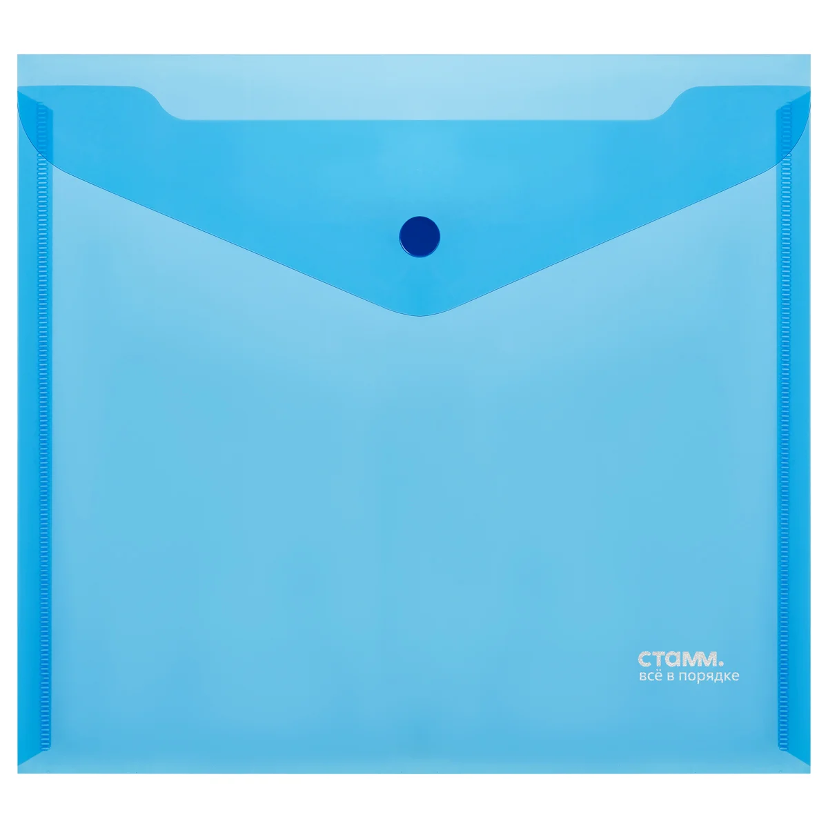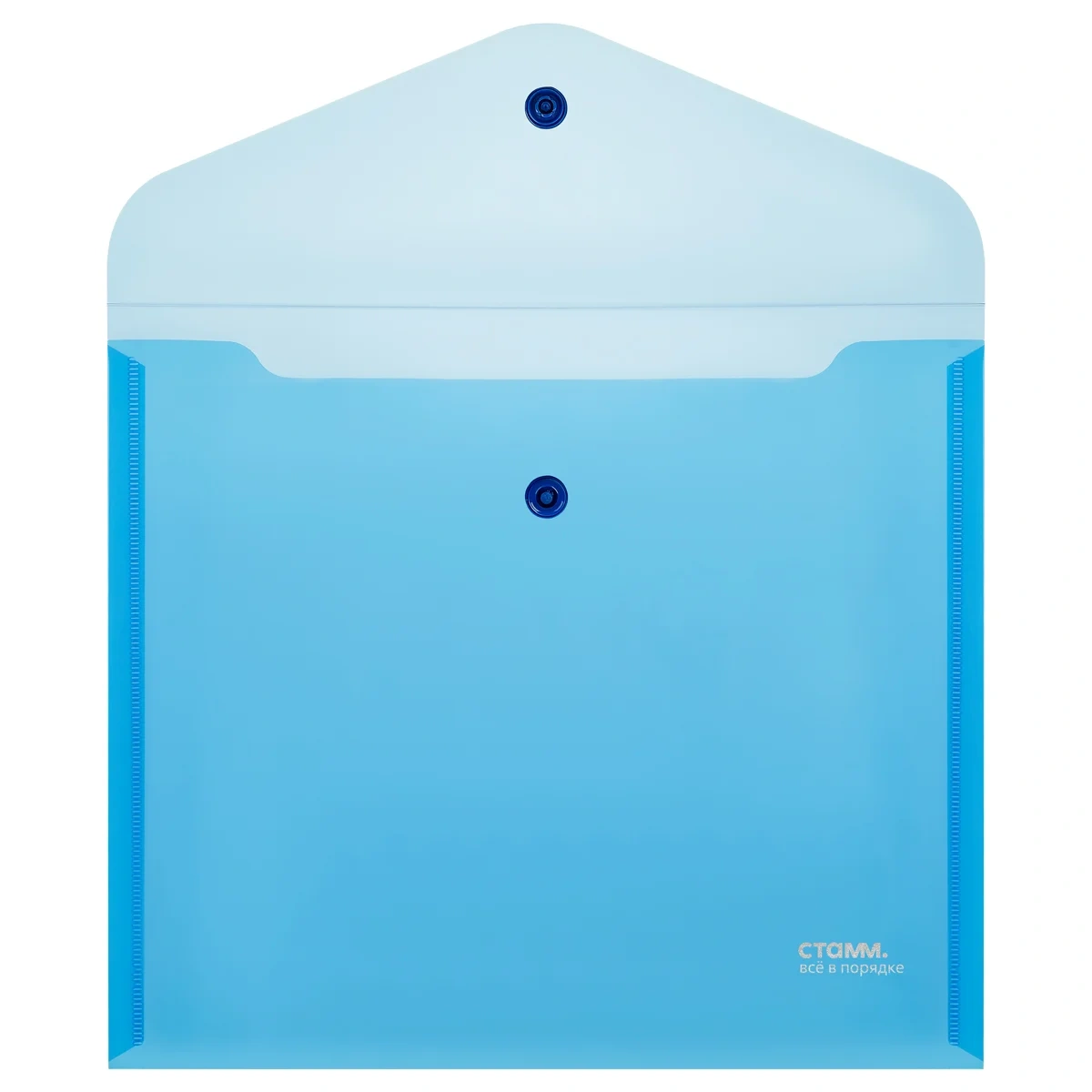 Папка-конверт на кнопке СТАММ А5+, 180мкм, пластик, прозрачная, синяя