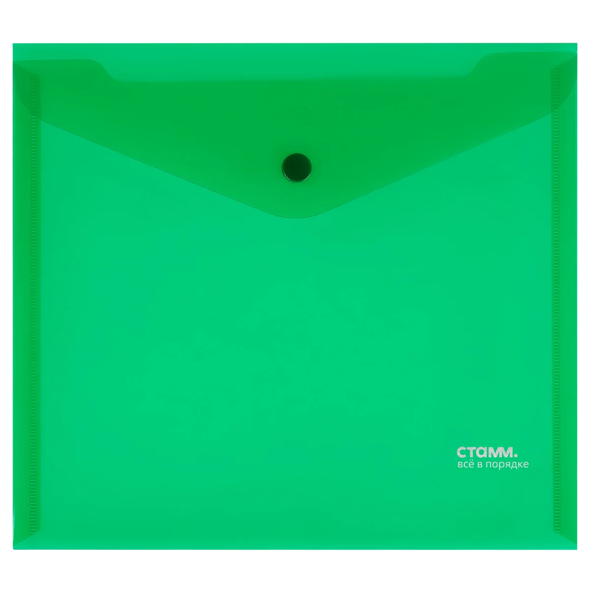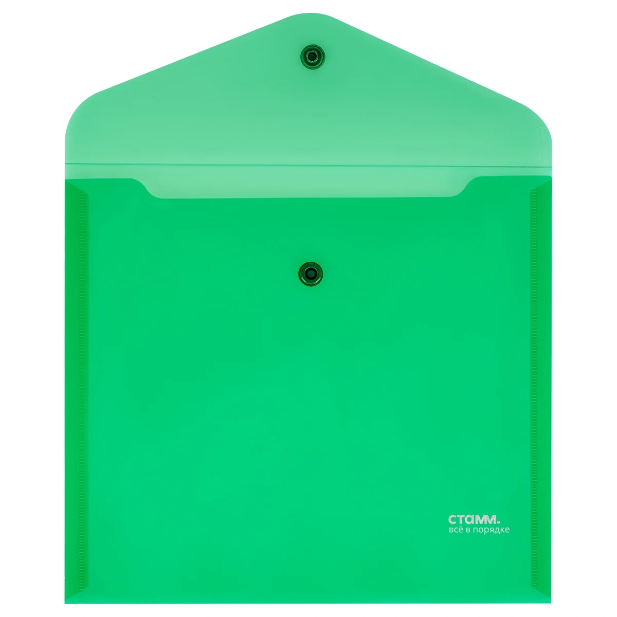 Папка-конверт на кнопке СТАММ А5+, 180мкм, пластик, прозрачная, зеленая