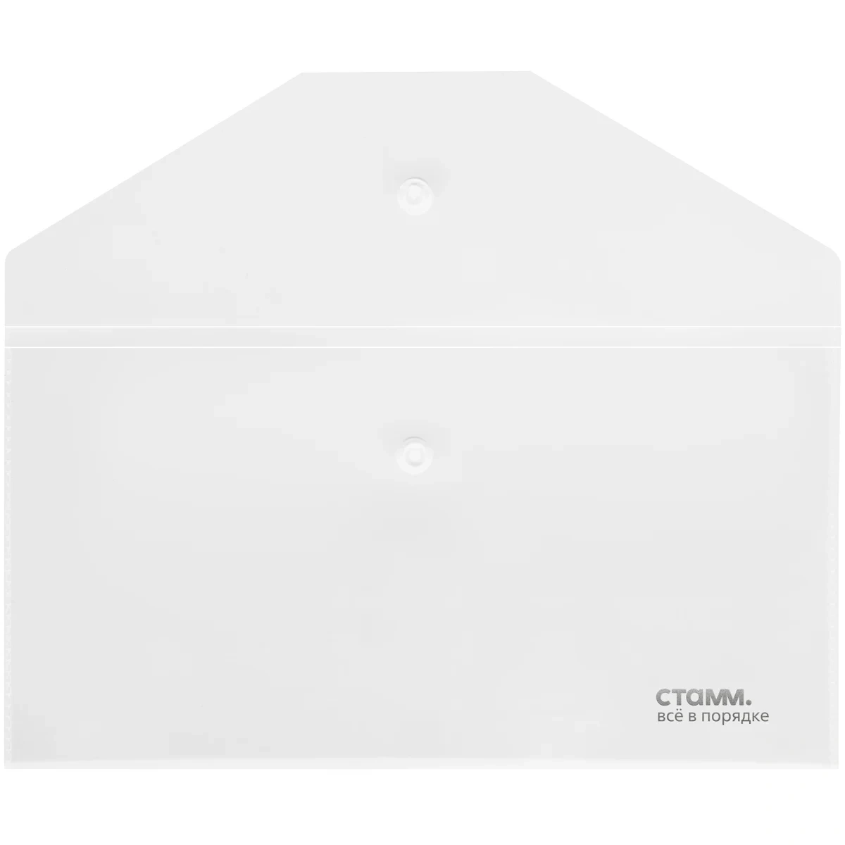 Папка–конверт на кнопке «СТАММ» формата С6 предназначена для хранения и транспортировки бумаг. Размер изделия составляет 223*120 мм, ориентация — горизонтальная. Папка изготовлена из качественного полипропилена толщиной 180 мкм. Вместимость — до 100 листов.