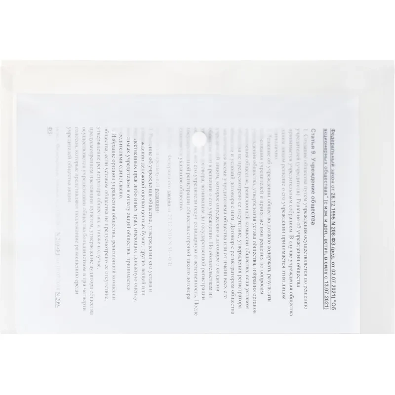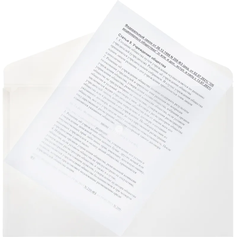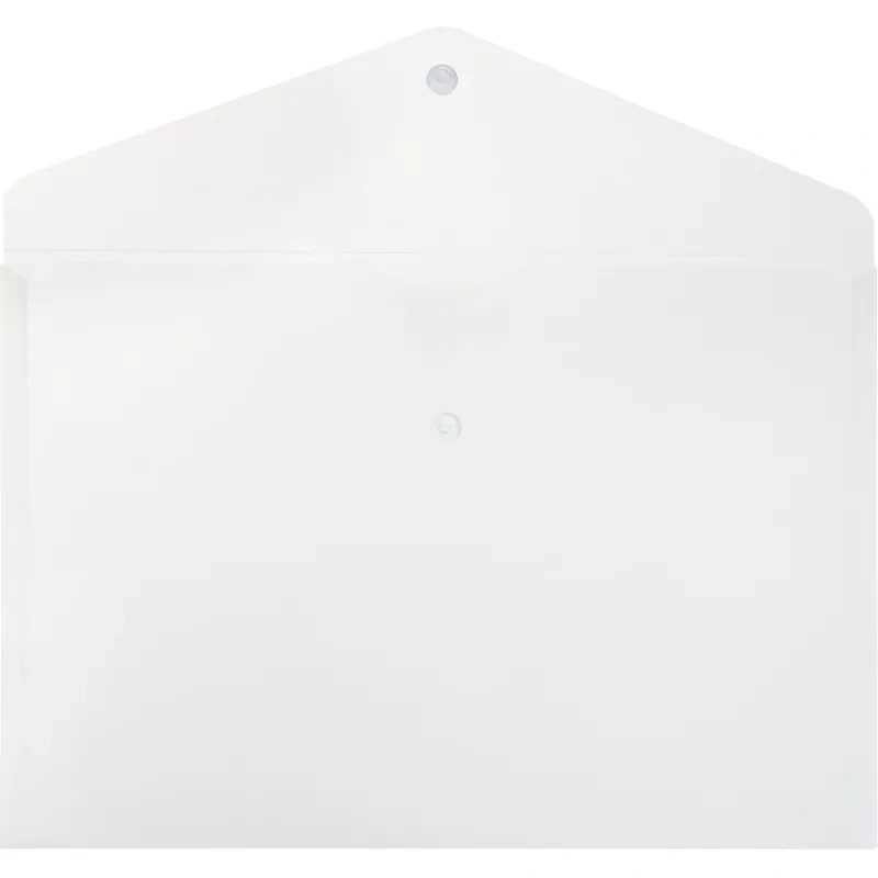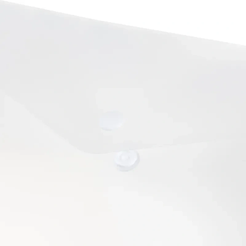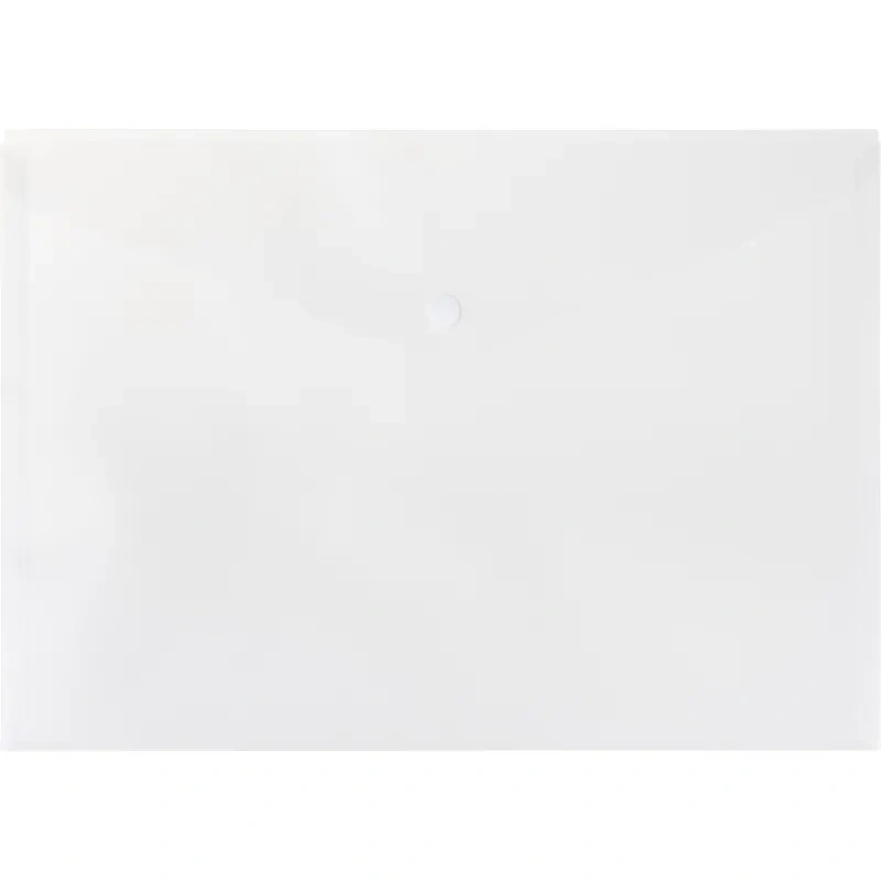 Папка-конверт на кнопке формата А4 надежно защищает документы от влаги и пыли. Горизонтальное размещение, вмещает до 100 листов. Цвет папки — бесцветный (прозрачный). Изготовлена из качественного полипропилена плотностью 150 мкм с гладкой текстурой. Размер папки составляет 340×240 мм. Изделие плотно закрывается на кнопку.