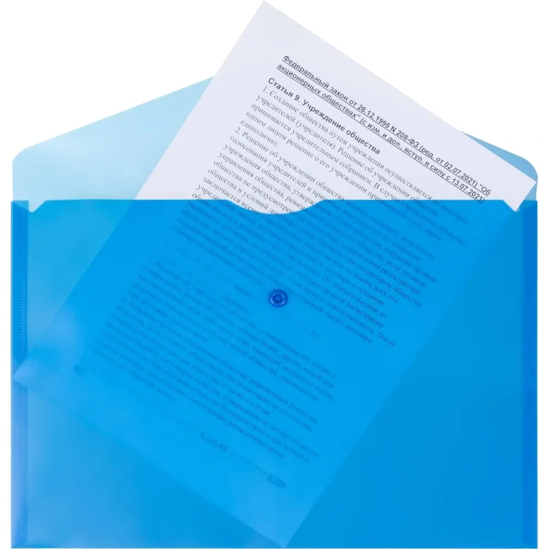 Папка-конверт на кнопке формата А4 надежно защищает документы от влаги и пыли. Горизонтальное размещение, вмещает до 100 листов. Цвет папки — прозрачный синий. Изготовлена из качественного полипропилена плотностью 180 мкм с гладкой текстурой. Размер папки составляет 340×240 мм. Изделие плотно закрывается на кнопку.