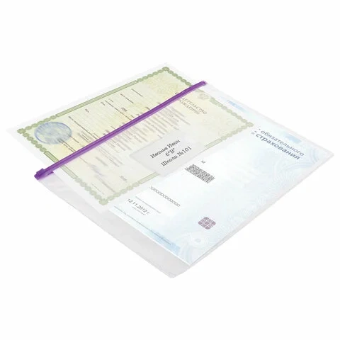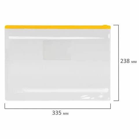 Изготовлена из прочного прозрачного пластика толщиной 0,12 мм с гладкой фактурой. Формат А4 (335х238 мм). Герметичная застежка-зиплок защищает документы от механических повреждений, а также пыли и влаги. Имеется карман для визитки. Цвет молнии - ассорти (поставляется без возможности выбора).