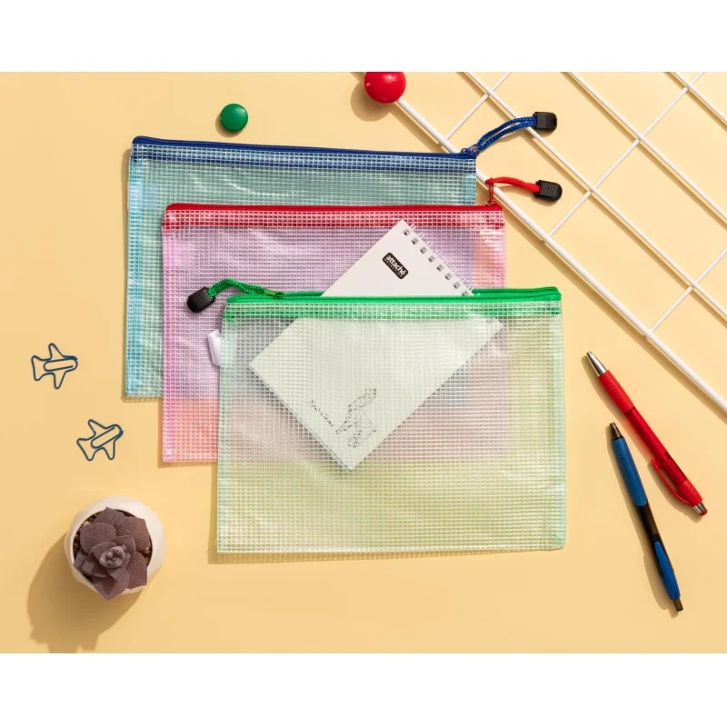 Папка-конверт на молнии Attache А5 (син,зел,крас), прозр,ПВХ, 230мкм,3шт/уп Папка-конверт на молнии Attache, формата А5, изготовлена и ПВХ с текстурой сетка, толщиной 230 мкм. Подходит для хранения и транспортипровки документов, мелких вещей и аксессуаров. Герметичная застежка молния защищает документов от пыли, влаги и механических повреждений. Различные цвета папок позволяют распредилить документы и не перепутать их в последствии (поставляется без возможности выбора цвета). Подходит для использования в офисе и дома.