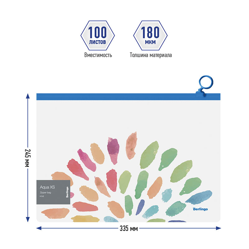 Папка-конверт пластиковая на молнии Berlingo 'Aqua XS' формата А4 с рисунком. Белый цвет внутренней поверхности. Надежная молния с мягким ходом и удобным бегунком-колечком. Быстрый доступ к содержимому. Изготовлена из высококачественного полипропилена с матовой текстурой поверхности 'апельсиновая корка', на которой не видно отпечатков пальцев и мелких царапин. Предназначена для хранения и транспортировки документов. Вмещает до 100 листов. Толщина 180мкм. Упаковка в прозрачный пакет по форме на 12шт. Индивидуальный штрих-код на каждой папке-конверте на съемном стикере с информацией.