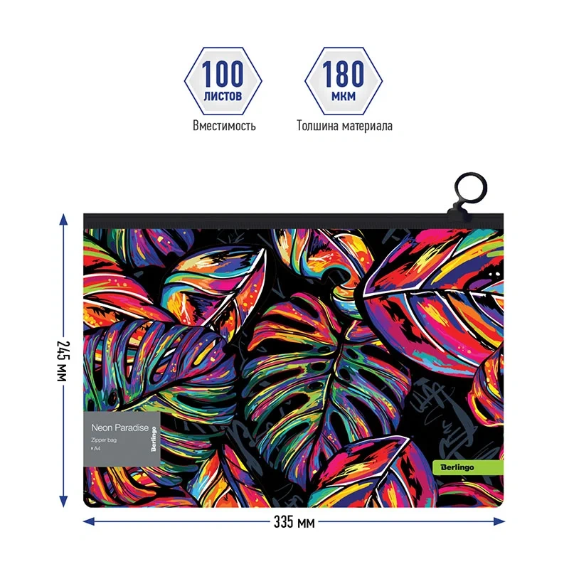 Папка-конверт пластиковая на молнии Berlingo 'Neon Paradise' формата А4 с рисунком. Белый цвет внутренней поверхности. Надежная молния с мягким ходом и удобным бегунком-колечком. Быстрый доступ к содержимому. Изготовлена из высококачественного полипропилена с матовой текстурой поверхности 'апельсиновая корка', на которой не видно отпечатков пальцев и мелких царапин. Предназначена для хранения и транспортировки документов. Вмещает до 100 листов. Толщина 180мкм. Упаковка в прозрачный пакет по форме на 12шт. Индивидуальный штрих-код на каждой папке-конверте на съемном стикере с информацией.