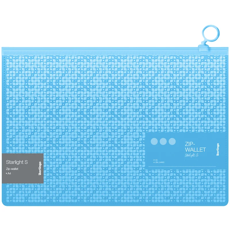 Папка-конверт пластиковая на молнии Berlingo 'Starlight S' формата А4, голубого цвета с рисунком. Надежная молния с мягким ходом и удобным бегунком-колечком. Быстрый доступ к содержимому. Изготовлена из высококачественного полипропилена с матовой текстурой поверхности 'апельсиновая корка', на которой не видно отпечатков пальцев и мелких царапин. Предназначена для хранения и транспортировки документов. Вмещает до 100 листов. Толщина 200мкм. Упаковка в прозрачный пакет по форме на 12шт. Индивидуальный штрих-код на каждой папке-конверте на съемном стикере с информацией.
