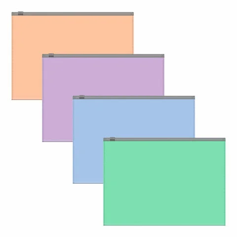 Цвет – ассорти: голубой, мятный, розовый, фиолетовый. Удобная ZIP-молния обеспечивает быстрый доступ к бумагам. Папка-конверт вмещает до 100 бумажных листов. Размер – 250х180 мм, толщина материала – 180 мкм.