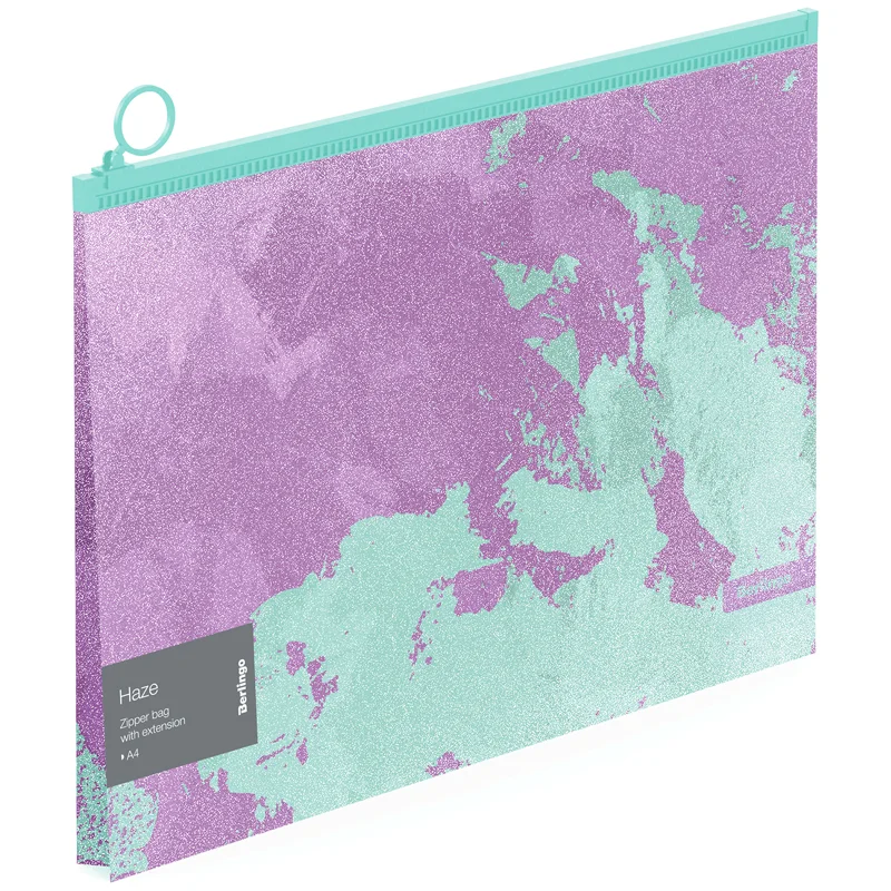 Папка-конверт на молнии с расширением Berlingo 'Haze' А4, 180мкм, сиреневая/мятная, эфф.блесток