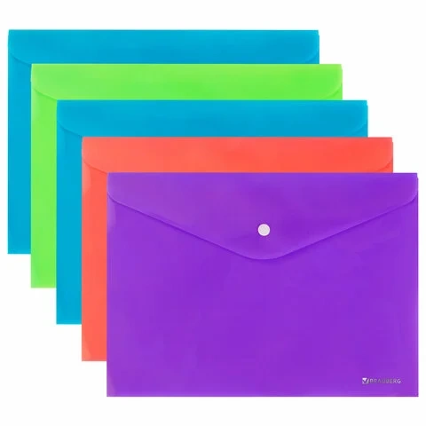 Папка-конверт с кнопкой А4, КОМПЛЕКТ 5 шт., яркие неоновые цвета ассорти, BRAUBERG 'NEON', 272872