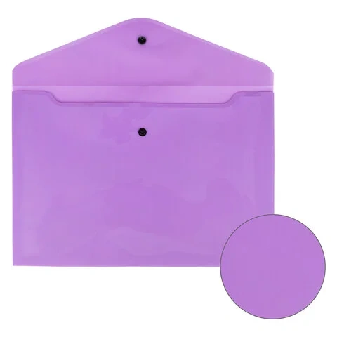 Папка-конверт с гладкой фактурой формата А4 изготовлена из плотного непрозрачного пластика лилового цвета толщиной 180 мкм. Закрывается на защелку-кнопку, что делает удобным частое использование и обеспечивает быстрый доступ к ее содержимому. Папка способна вместить до 100 листов стандартной плотности.