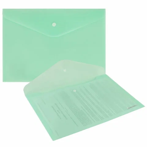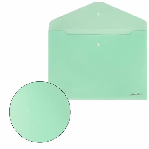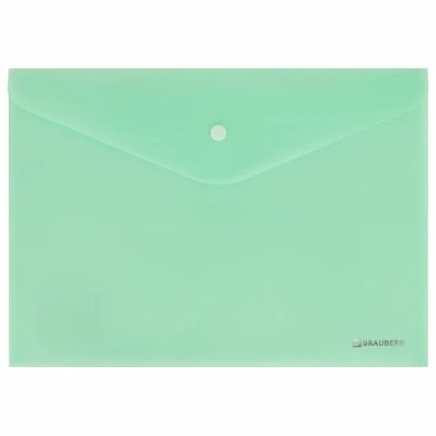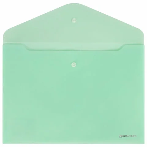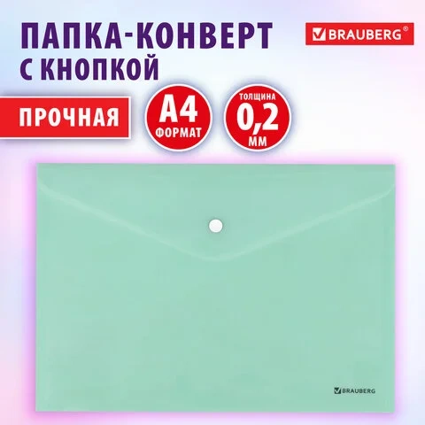 Папка-конверт с кнопкой BRAUBERG 'Pastel', А4, матовая непрозрачная, мятная, ПРОЧНАЯ 0,2 мм, 272883