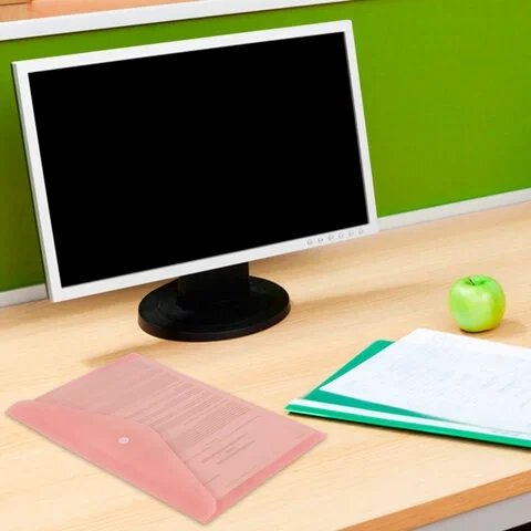 Папка-конверт с матовой фактурой формата А4 изготовлена из плотного непрозрачного пластика. Цвет – персиковый, толщина – 200 мкм. Закрывается на защелку-кнопку, что делает удобным частое использование и обеспечивает быстрый доступ к содержимому. Папка способна вместить до 100 листов стандартной плотности.
