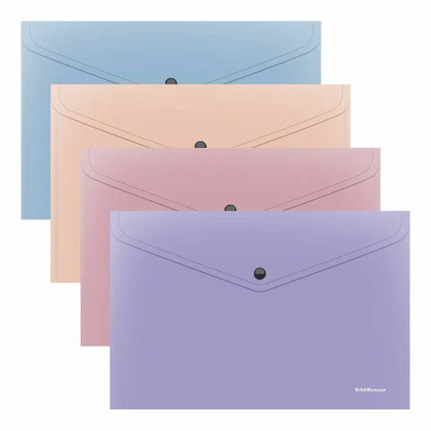 Цвет папки – ассорти: бежевый, голубой, розовый, фиолетовый. Надежная застежка-кнопка обеспечивает быстрый доступ к документам. Папка вмещает до 120 бумажных листов. Размер – 232х333 мм, толщина – 180 мкм.