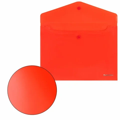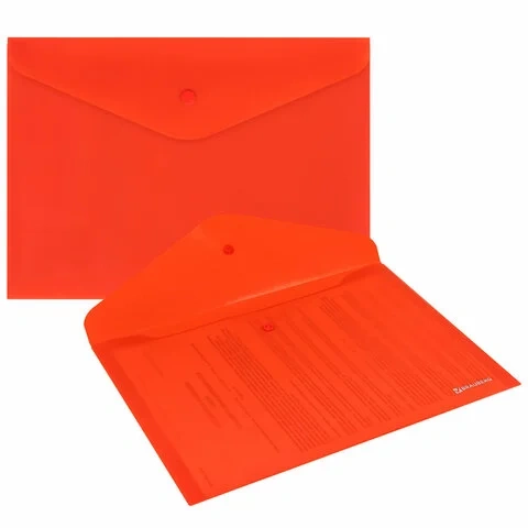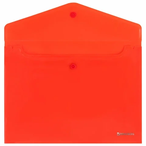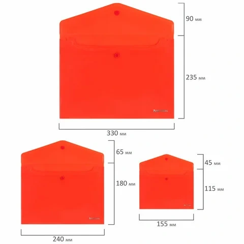 Папки-конверты с гладкой фактурой формата А4 (330х235 мм), А5 (240х180 мм) и А6 (155х115 мм) изготовлены из плотного непрозрачного пластика. Цвета – ассорти, толщина – 180 мкм. Закрываются на защелку-кнопку, что делает удобным частое использование и обеспечивает быстрый доступ к содержимому. Папка способна вместить от 50 до 100 листов стандартной плотности (зависит от формата папки).