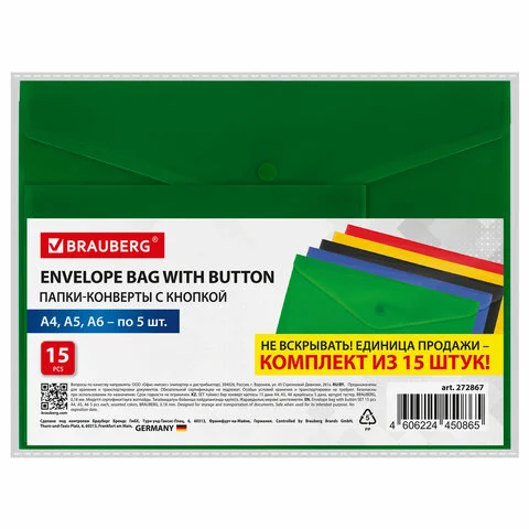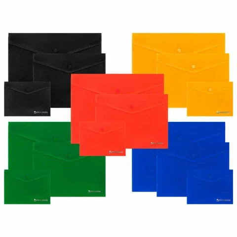 Папка-конверт с кнопкой КОМПЛЕКТ 15 шт., А4, А5, А6 по 5 шт., цвета ассорти, BRAUBERG, 0,18 мм, 2728