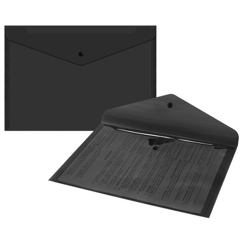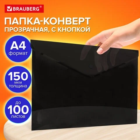 Папка-конверт с кнопкой прозрачная А4, BRAUBERG 'UNIVERSAL', до 100 листов, черная, 0,15 мм, 273072