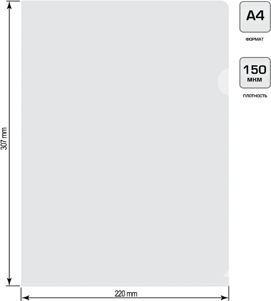 Папка-конверт с гладкой фактурой формата А5 изготовлена из плотного прозрачного пластика черного цвета толщиной 150 мкм.