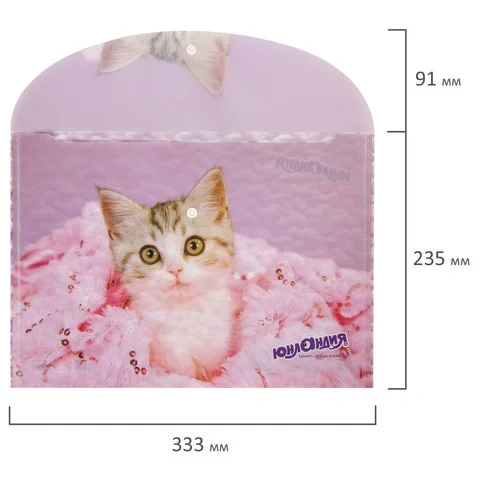 Папка-конверт формата А4 из плотного пластика в 160 мкм с полноцветной печатью. Закрывается на защелку-кнопку, что способствует удобству для частого использования и обеспечивает быстрый доступ к бумагам. Вместительность до 100 листов поможет хранить или взять с собой необходимые документы. Гладкая фактура с полноцветным рисунком котенка вызовет улыбку у ребенка и взрослого. Папка ЮНЛАНДИЯ практична в использовании и надежно защитит документы и сбережет их от повреждений, пыли и влаги.