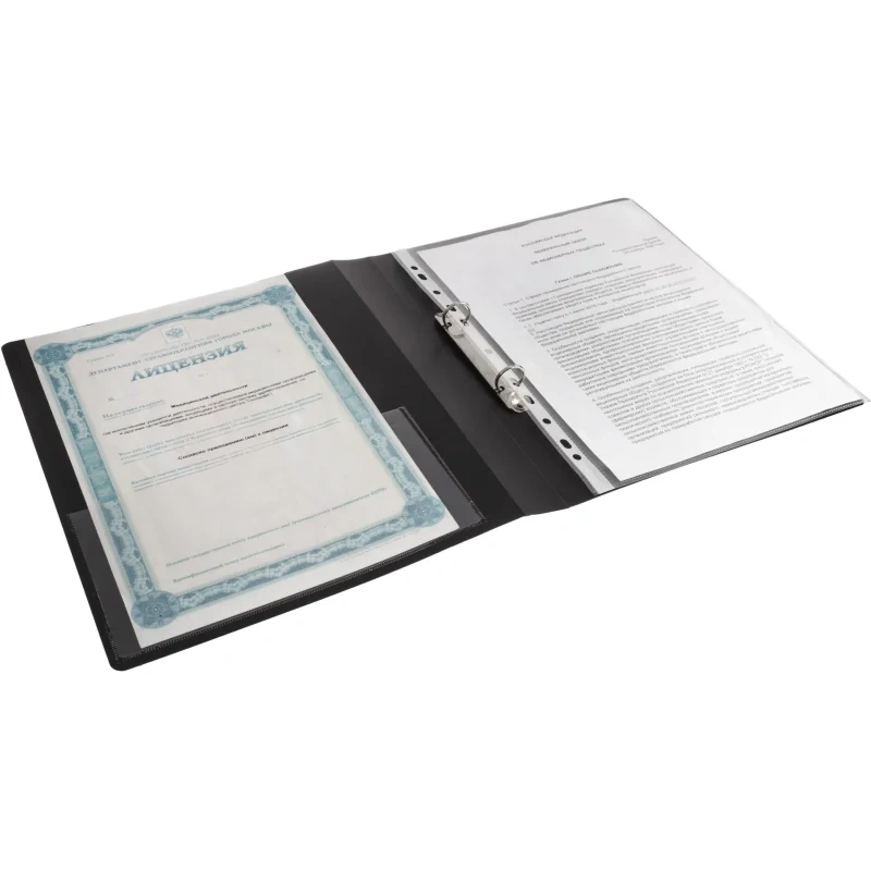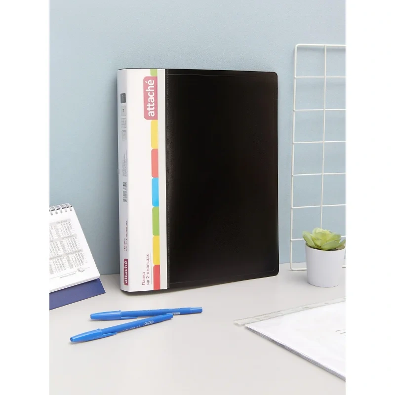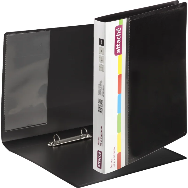 Папка на кольцах рекомендуются как для временного, так и длительного хранения, систематизации, архивирования документов. Такие папки используются в работе офисными сотрудниками различных специальностей, направлений, должностей. Можно использовать для домашних документов. Папка на двух кольцах Attache изготовлена из листового полипропилена толщиной 0,7 мм черного цвета. Формат А4. Снабжена механизмом на двух O-кольцах. Диаметр кольца — 25 мм. На внутренней стороне обложки есть прозрачный карман для документов. Корешок шириной 32 мм имеет карман для сменной этикетки. Папка на кольцах вмещает до 200 листов стандартной плотности.