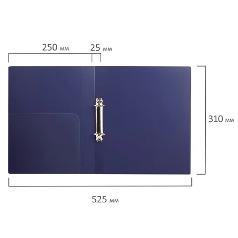 Папка стандартного формата А4 вмещает до 170 листов. Изготовлена из плотного картона с покрытием ПВХ толщиной 2 мм с гладкой фактурой. Допускается влажная обработка поверхности. Внутренняя сторона обложки снабжена прозрачным карманом. Для идентификации имеется сменный бумажный корешок. Ширина корешка составляет 25 мм. Папка оснащена двумя кольцами, которые обеспечивают надежное хранение документов. В неё можно вставить файлы или проколотые дыроколом листы и, при необходимости, заменить их на другие. Каждая папка упакована в индивидуальный пакет.