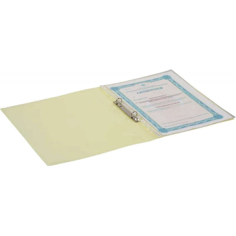 Папка на кольцах изготовлена и полипропилена толщиной 350 мкм. Вмещает до 150 листов бумаги формата А4. Цвет желтый. Ширина корешка — 20 мм.