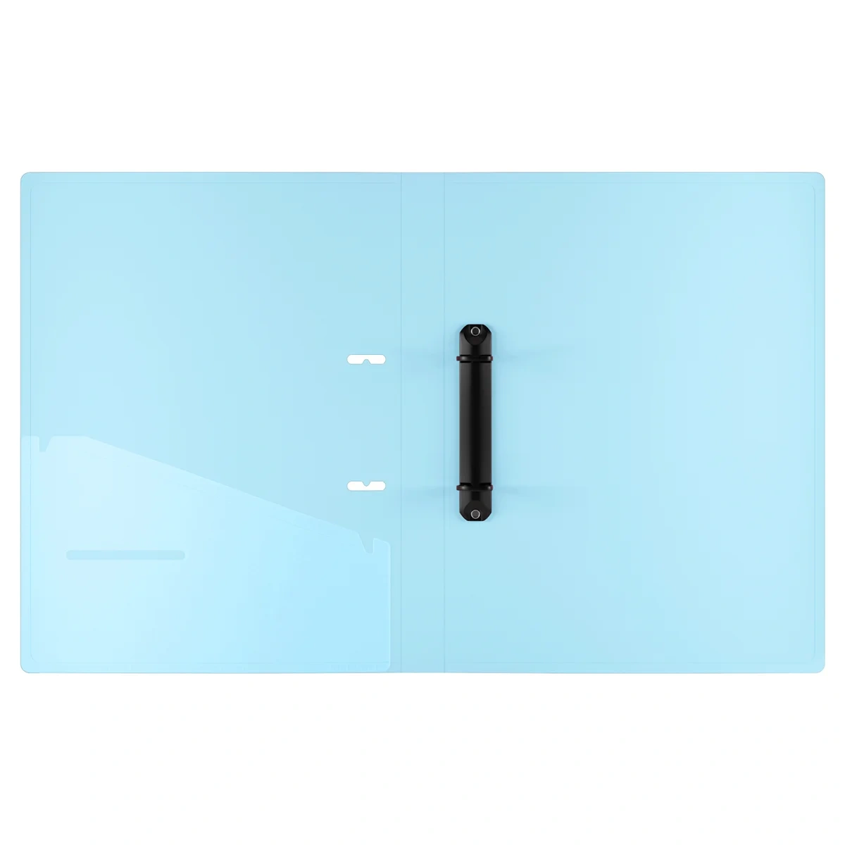 Вместимость папки – 150 листов, ширина корешка – 24 мм. Кольцевой механизм с 2 кольцами диаметром 20 мм надежно держит перфорированные документы и документы, помещенные в файлы-вкладыши. Специальная D-форма колец помогает удобно и ровно хранить документы, которые могут быть выровнены по левому краю, благодаря боковой вертикальной стенке кольца. Специальные формовые отверстия в обложке служат для надёжного защелкивания папки в сложенном виде, предотвращают случайное открытие обложки и замятие документов внутри при хранении и транспортировке.