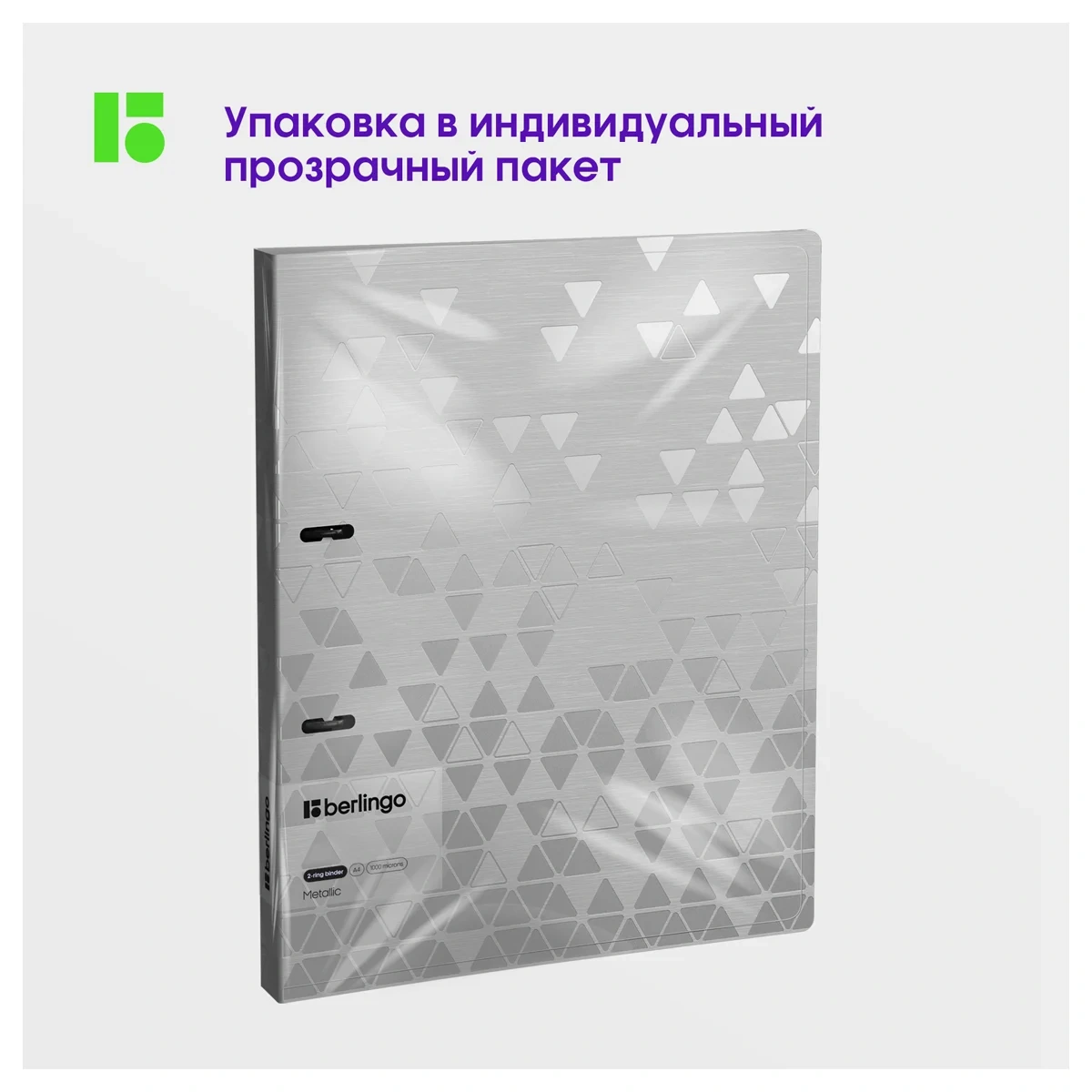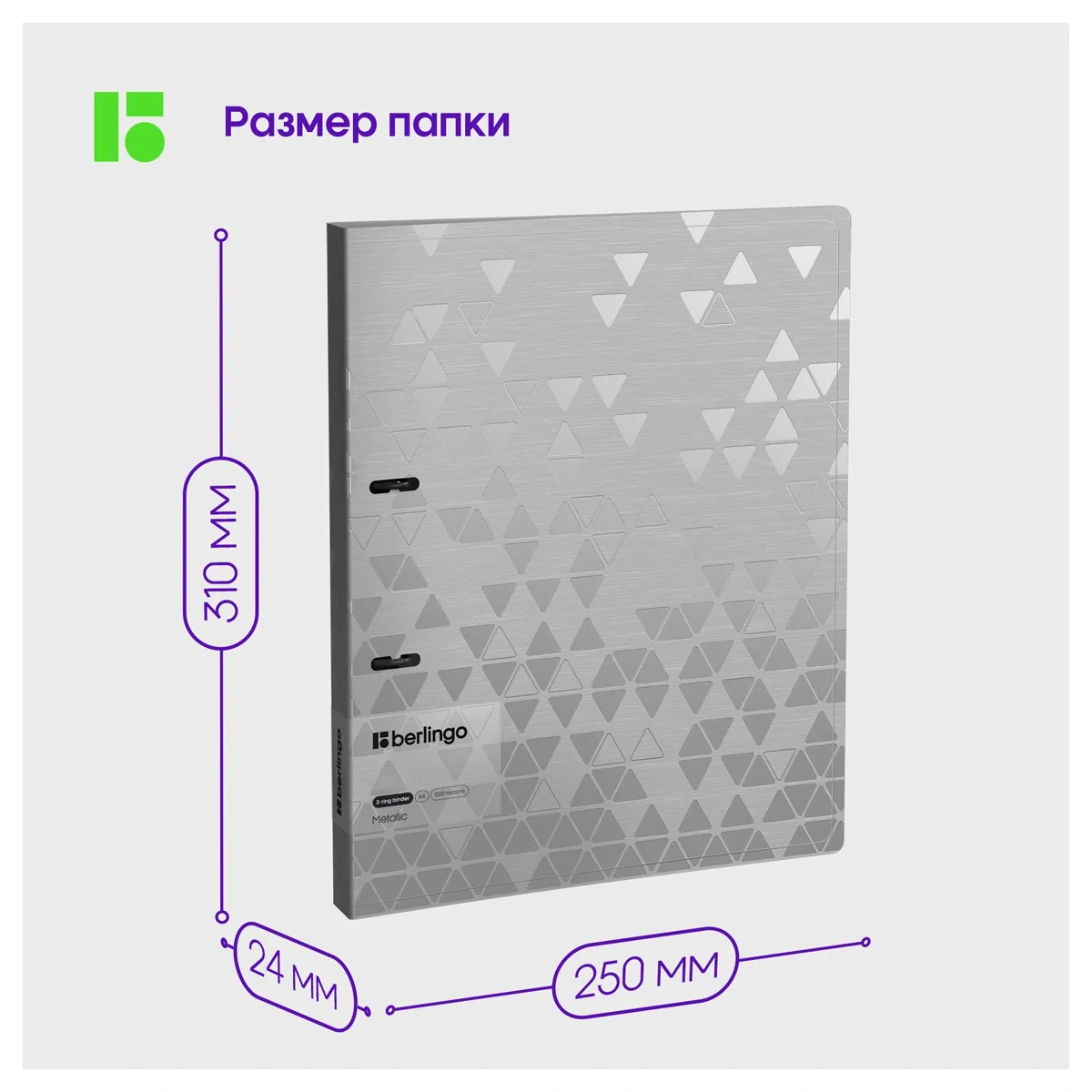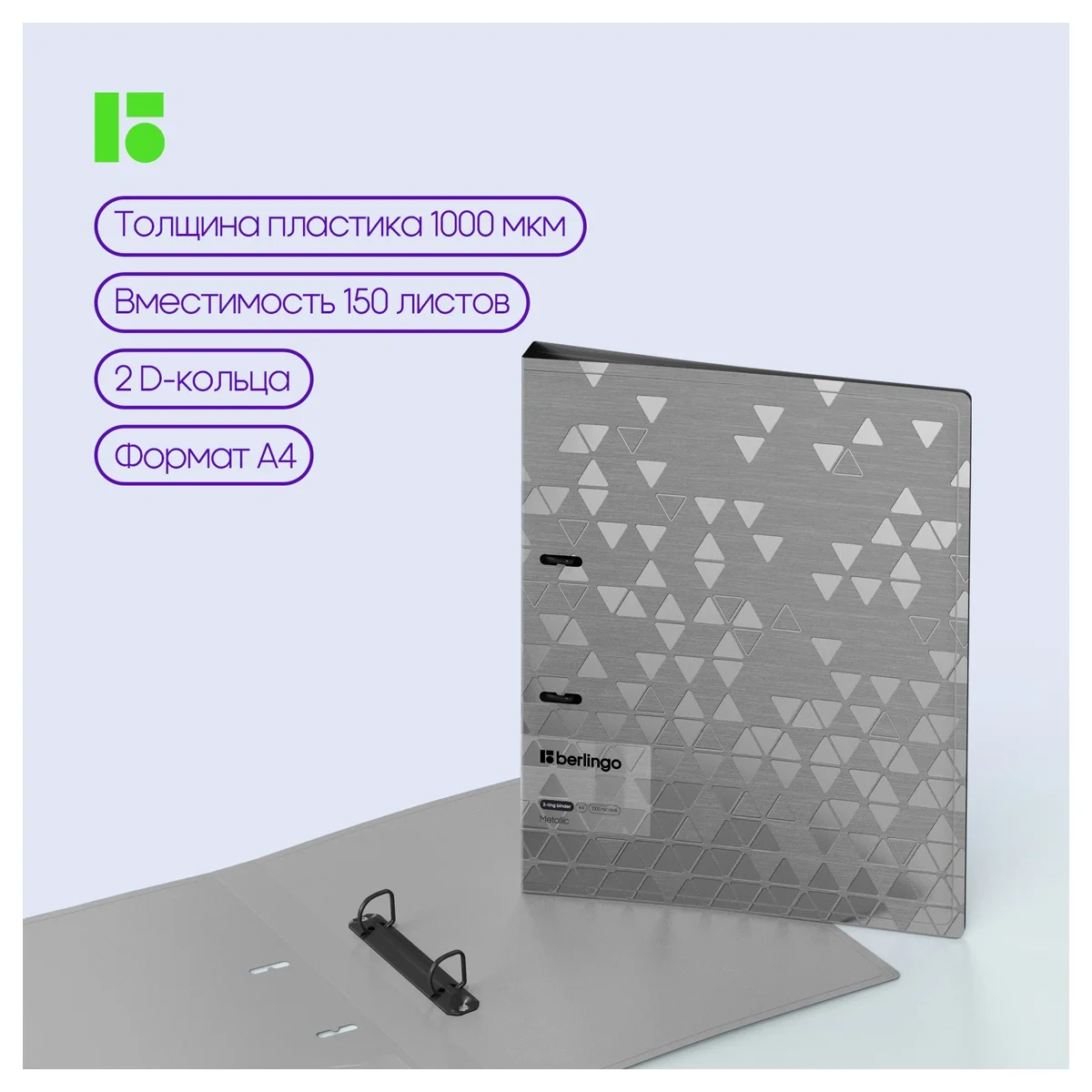Папка на 2 кольцах Berlingo серии Metallic формата А4 (310*250*24 мм) изготовлена из плотного пластика толщиной 1 мм. Вместимость папки – 150 листов, ширина корешка – 24 мм. Кольцевой механизм с 2 кольцами диаметром 20 мм надежно держит перфорированные документы и документы, помещенные в файлы-вкладыши. Специальная D форма колец помогает удобно и ровно хранить документы, которые могут быть выровнены по левому краю, благодаря боковой вертикальной стенке кольца. Диаметр колец – 20 мм. Специальные формовые отверстия в обложке служат для надёжного защелкивания папки в сложенном виде, предотвращают случайное открытие обложки и замятие документов внутри при хранении и транспортировке. Изготовлена из высококачественного полипропилена с матовой текстурой поверхности «рельефные треугольники», на которой не видно отпечатков пальцев и мелких царапин. Предназначена для хранения документов. На внутренней стороне обложки оснащена плотным прозрачным карманом для удобного хранения мелочей: ручки, заметок, визиток, дисков, флешек и др. Упакована в индивидуальный прозрачный пакет по форме.