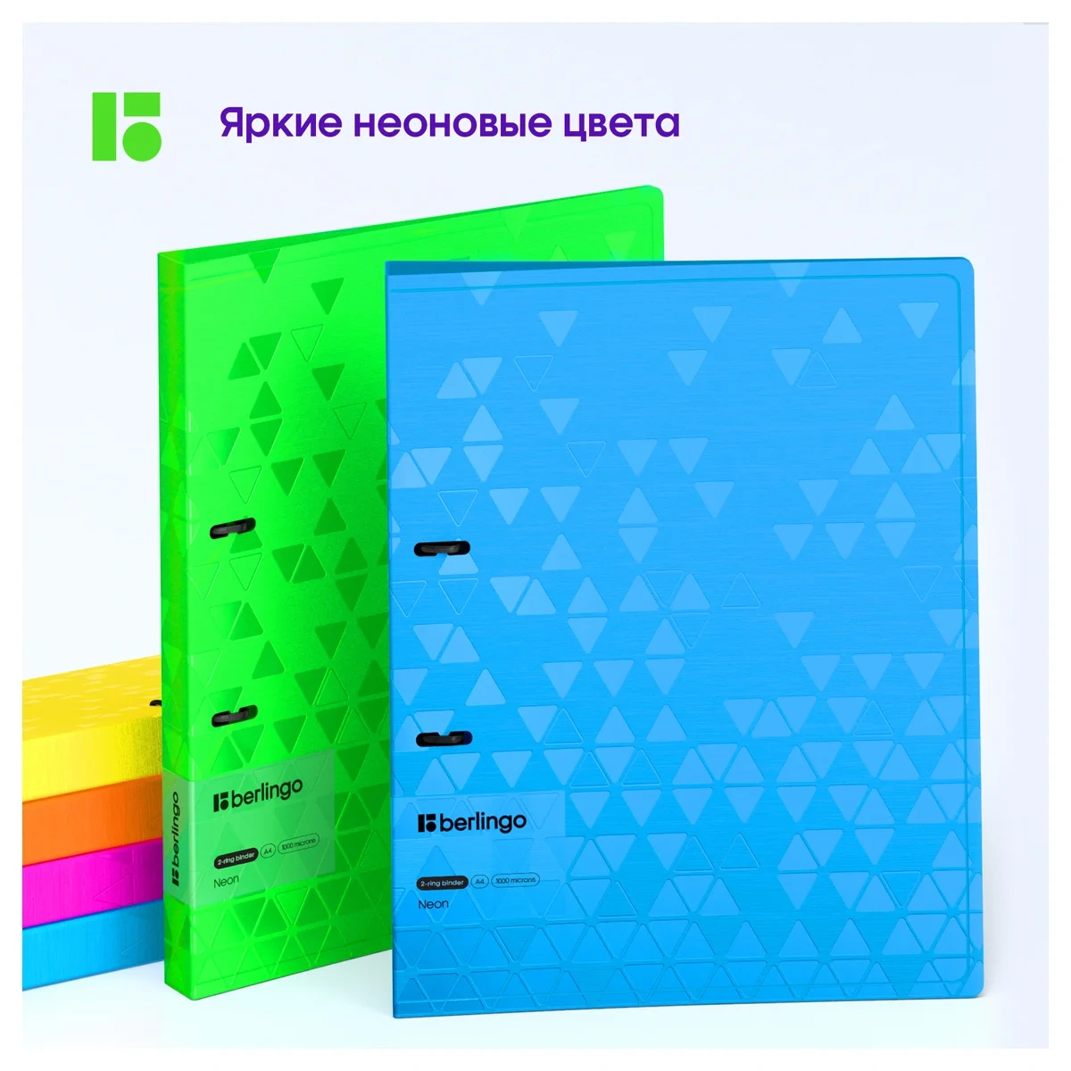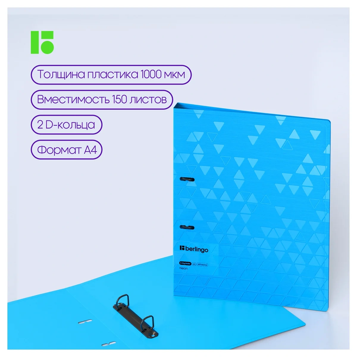 Папка на 2 кольцах Berlingo серии Neon формата А4 (310*250*24 мм) изготовлена из плотного пластика толщиной 1 мм. Вместимость папки – 150 листов, ширина корешка – 24 мм. Кольцевой механизм с 2 кольцами диаметром 20 мм надежно держит перфорированные документы и документы, помещенные в файлы-вкладыши. Специальная D форма колец помогает удобно и ровно хранить документы, которые могут быть выровнены по левому краю, благодаря боковой вертикальной стенке кольца. Диаметр колец – 20 мм. Специальные формовые отверстия в обложке служат для надёжного защелкивания папки в сложенном виде, предотвращают случайное открытие обложки и замятие документов внутри при хранении и транспортировке. Изготовлена из высококачественного полипропилена с матовой текстурой поверхности «рельефные треугольники», на которой не видно отпечатков пальцев и мелких царапин. Предназначена для хранения документов. На внутренней стороне обложки оснащена плотным прозрачным карманом для удобного хранения мелочей: ручки, заметок, визиток, дисков, флешек и др. Упакована в индивидуальный прозрачный пакет по форме.