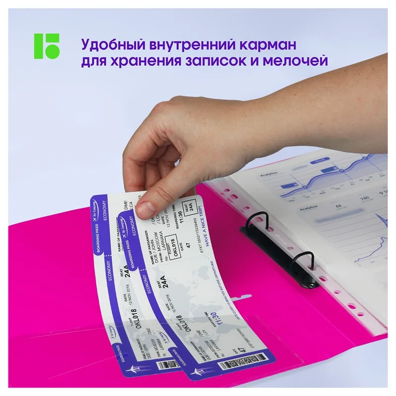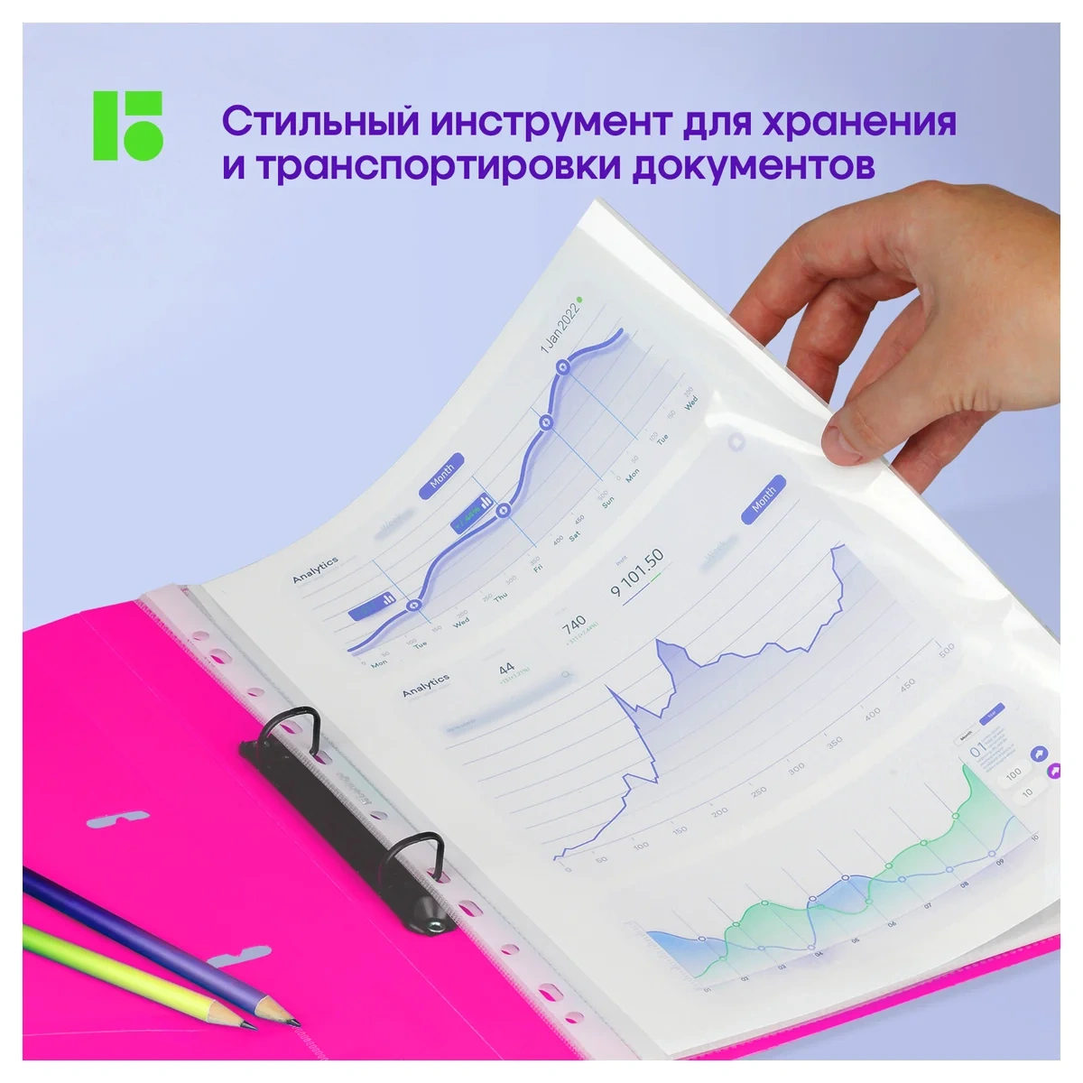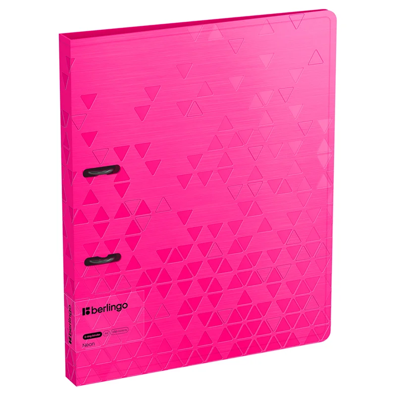 Папка на 2 кольцах Berlingo серии Neon формата А4 (310*250*24 мм) изготовлена из плотного пластика толщиной 1 мм. Вместимость папки – 150 листов, ширина корешка – 24 мм. Кольцевой механизм с 2 кольцами диаметром 20 мм надежно держит перфорированные документы и документы, помещенные в файлы-вкладыши. Специальная D форма колец помогает удобно и ровно хранить документы, которые могут быть выровнены по левому краю, благодаря боковой вертикальной стенке кольца. Диаметр колец – 20 мм. Специальные формовые отверстия в обложке служат для надёжного защелкивания папки в сложенном виде, предотвращают случайное открытие обложки и замятие документов внутри при хранении и транспортировке. Изготовлена из высококачественного полипропилена с матовой текстурой поверхности «рельефные треугольники», на которой не видно отпечатков пальцев и мелких царапин. Предназначена для хранения документов. На внутренней стороне обложки оснащена плотным прозрачным карманом для удобного хранения мелочей: ручки, заметок, визиток, дисков, флешек и др. Упакована в индивидуальный прозрачный пакет по форме.
