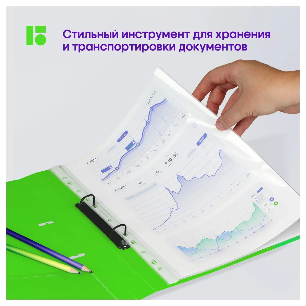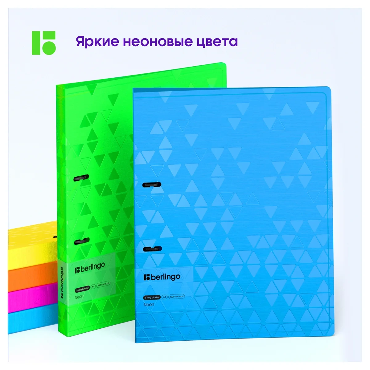 Папка на 2 кольцах Berlingo серии Neon формата А4 (310*250*24 мм) изготовлена из плотного пластика толщиной 1 мм. Вместимость папки – 150 листов, ширина корешка – 24 мм. Кольцевой механизм с 2 кольцами диаметром 20 мм надежно держит перфорированные документы и документы, помещенные в файлы-вкладыши. Специальная D форма колец помогает удобно и ровно хранить документы, которые могут быть выровнены по левому краю, благодаря боковой вертикальной стенке кольца. Диаметр колец – 20 мм. Специальные формовые отверстия в обложке служат для надёжного защелкивания папки в сложенном виде, предотвращают случайное открытие обложки и замятие документов внутри при хранении и транспортировке. Изготовлена из высококачественного полипропилена с матовой текстурой поверхности «рельефные треугольники», на которой не видно отпечатков пальцев и мелких царапин. Предназначена для хранения документов. На внутренней стороне обложки оснащена плотным прозрачным карманом для удобного хранения мелочей: ручки, заметок, визиток, дисков, флешек и др. Упакована в индивидуальный прозрачный пакет по форме.