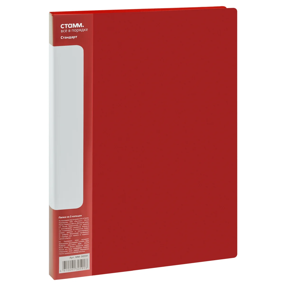 Папка на 2 кольцах СТАММ 'Стандарт' предназначена для хранения перфорированных документов формата А4. Цвет папки – красный. Изготовлена из качественного полипропилена толщиной 700 мкм с текстурой «песок». Размер изделия составляет 310*250 мм. Ширина корешка 25 мм позволяет вмещать в папку до 120 листов. Кольцевой механизм, состоящий из 2 колец диаметром 16 мм, надёжно держит документы. На корешке и внутренней стороне папки имеется карман. Папка упакована в индивидуальный пакет.