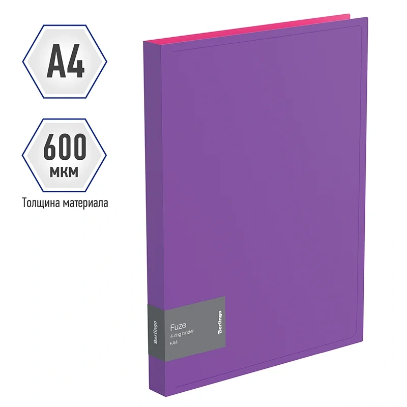 Папка на 4-х кольцах Berlingo серия Fuze формата А4 станет идеальным помощником в учёбе и работе. Папка размером 305*250*25 мм изготовлена из плотного пластика фиолетового цвета снаружи и розового цвета внутри толщиной 600 мкм с текстурой «песок» и предназначена для хранения перфорированных документов и документов, вложенных в перфофайлы. Ширина корешка 25 мм. Кольца в количестве четырёх штук на папке имеют диаметр 17 мм. Папка выполнена в ярких контрастных цветах концепции Fuze.