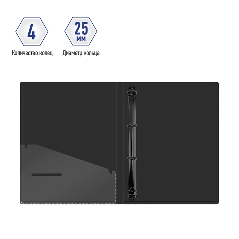 Папка пластиковая на 4-х кольцах для хранения перфорированных документов и документов, вложенных в перфофайлы. Изготовлена из плотного фактурного пластика толщиной 1 мм. Яркие насыщенные цвета. Черный цвет внутренней поверхности. Черный цвет колец. Специальная D форма колец помогает удобно и ровно хранить документы, которые могут быть выровнены по левому краю, благодаря боковой вертикальной стенке кольца. Дополнительный внутренний карман для удобного хранения мелочей. Индивидуальная упаковка в пакет.