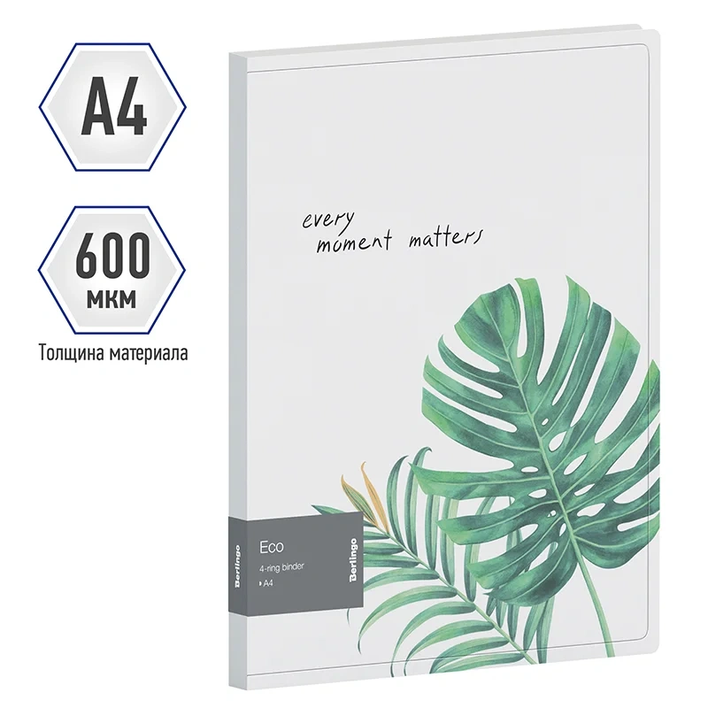 Папка на 4-х D-кольцах Berlingo серии Eco формата А4 - стильный аксессуар для офиса и учёбы с рисунком на белом фоне. Изготовлена из высококачественного полипропилена с матовой текстурой поверхности 'песок', на которой не видно отпечатков пальцев и мелких царапин. Внутренняя поверхность имеет белый цвет. Толщина обложки - 600 мкм. Ширина корешка составляет 24 мм. Специальная D-форма колец диаметром 20 мм помогает удобно и ровно хранить документы, которые могут быть выровнены по левому краю, благодаря боковой вертикальной стенке кольца. Вместимость папки – 150 листов. Специальные формовые отверстия в обложке служат для надежного защелкивания папки в сложенном виде, предотвращают случайное открытие обложки и замятие документов внутри при хранении и транспортировке. На внутренней стороне обложки папка оснащена плотным прозрачным карманом для удобного хранения мелочей: ручки, заметок, визиток, дисков, флешек и др. Размер папки составляет 310*233*24 мм. Упакована в индивидуальный прозрачный пакет по форме.• Вместимость, в листах: 150;• Формат: А4;• Цвет: рисунок;• Ширина корешка: 24 мм