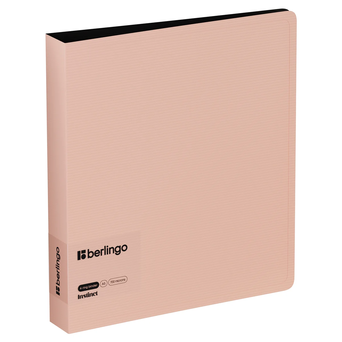 Папка на 4 D–кольцах Berlingo серии Instinct формата А5 – стильный аксессуар для офиса и учёбы. Насыщенный пастельный розовый цвет внешней стороны в сочетании с фактурой «горизонтальные линии», чёрный цвет внутренней поверхности. Толщина обложки – 700 мкм. Ширина корешка составляет 35 мм. Стильные черные кольца и фурнитура. Специальная D–форма колец диаметром 30 мм помогает удобно и ровно хранить документы, которые могут быть выровнены по левому краю, благодаря боковой вертикальной стенке кольца. Вместимость папки – 200 листов. На внутренней стороне обложки папка оснащена плотным прозрачным карманом для удобного хранения мелочей: ручки, заметок, визиток, дисков, флешек и др. Размер папки составляет 225*200*35 мм. Упакована в индивидуальный прозрачный пакет по форме.