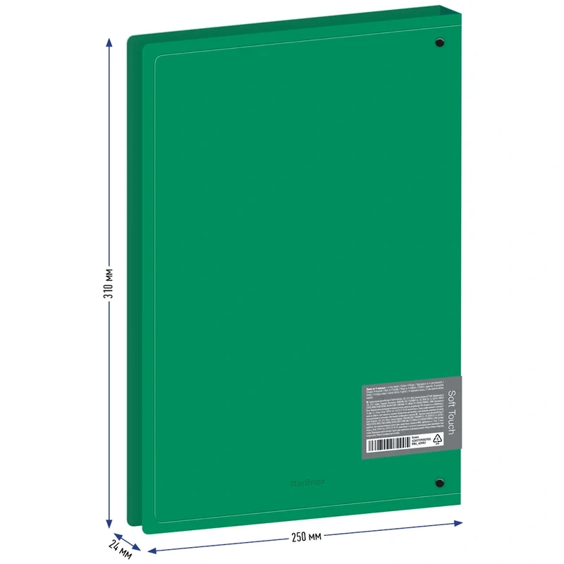 Папка на 4-х D-кольцах Berlingo серии Soft Touch формата А4 - стильный аксессуар для офиса и учёбы с плотной обложкой с приятной софт-тач фактурой. Изготовлена из высококачественного полипропилена толщиной 700 мкм с особой фактурой с эффектом софт-тач. Ширина корешка составляет 24 мм. Ширина папки составляет 250мм. Папка оснащена стильными черными кольцами, которые крепятся на заднюю стенку. Специальная D-форма колец диаметром 20 мм помогает удобно и ровно хранить документы, которые могут быть выровнены по левому краю, благодаря боковой вертикальной стенке кольца. Вместимость папки – 150 листов. На внутренней стороне обложки папка оснащена плотным прозрачным карманом для удобного хранения мелочей: ручки, заметок, визиток, дисков, флешек и др. Корешок папки оклеен специальным стикером для подписи содержимого, что позволяет легко и удобно организовывать документы на полке. Размер папки составляет 310*250*24 мм. Упакована в индивидуальный прозрачный пакет по форме. Папка оснащена съемным стикером с выходной информацией и штрих-кодом.