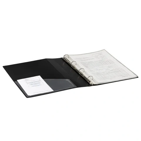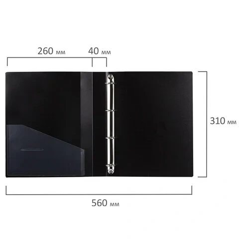 Папка стандартного формата А4 вмещает до 300 листов. Изготовлена из высококачественного пластика толщиной 0,8 мм черного цвета со стандартной фактурой. Допускается влажная обработка поверхности. Внутренняя сторона обложки снабжена прозрачным карманом. Для идентификации содержимого на корешке папки имеется карман. Ширина корешка составляет 40 мм. Папка оснащена четырьмя кольцами, которые обеспечивают надежное хранение документов. В неё можно вставлять файлы или проколотые дыроколом листы и, при необходимости, заменять их на другие. Каждая папка упакована в индивидуальный пакет.
