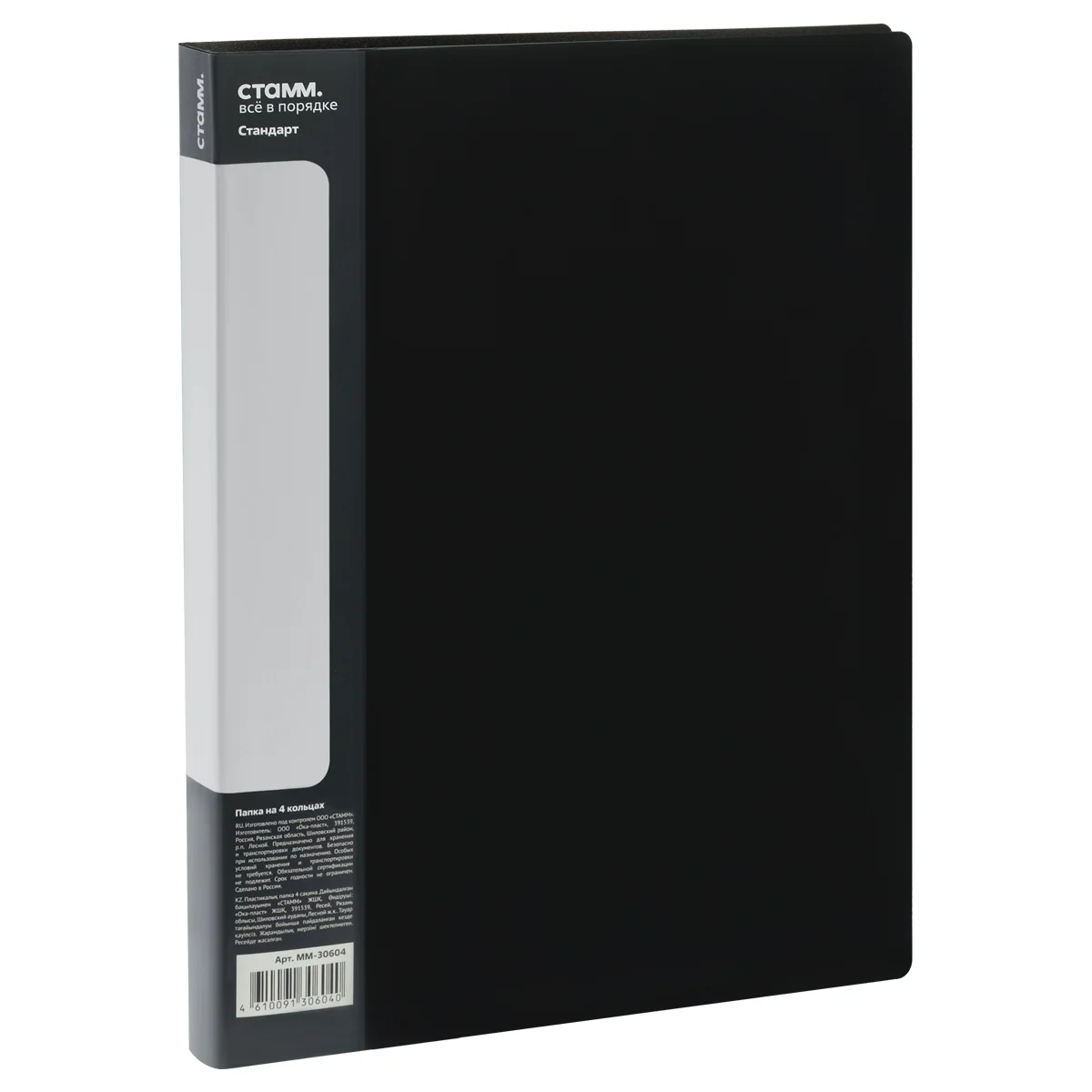 Папка на 4 кольцах СТАММ 'Стандарт' предназначена для хранения перфорированных документов формата А4. Цвет папки – чёрный. Изготовлена из качественного полипропилена толщиной 700 мкм с текстурой «песок». Размер изделия составляет 310*250 мм. Ширина корешка 25 мм позволяет вмещать в папку до 120 листов. Кольцевой механизм, состоящий из 4 колец диаметром 16 мм, надёжно держит документы. На корешке и внутренней стороне папки имеется карман. Папка упакована в индивидуальный пакет.